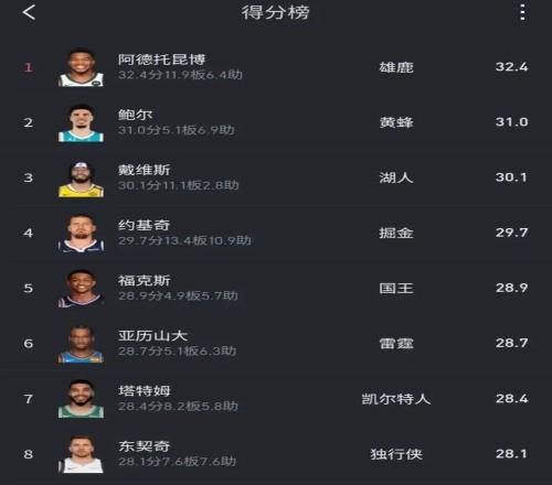 本季不知哪天的得分榜,好像不是按身高来的吧。