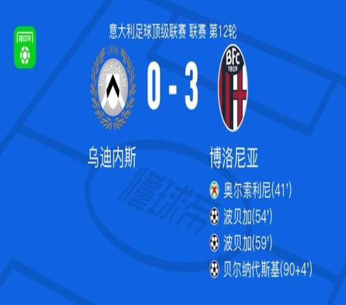 北京时间11月22日意大利足球顶级联赛 联赛 第12轮,乌迪内斯主场对阵博洛尼亚。博洛尼亚波贝加梅开二度,贝尔纳代斯基破门。最终比分乌迪内斯 0-3 博洛尼亚。
