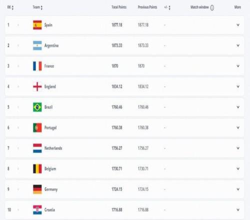世界排名前十名分别是西班牙、阿根廷、法国、英格兰、巴西、葡萄牙、荷兰、比利时、德国与克罗地亚。